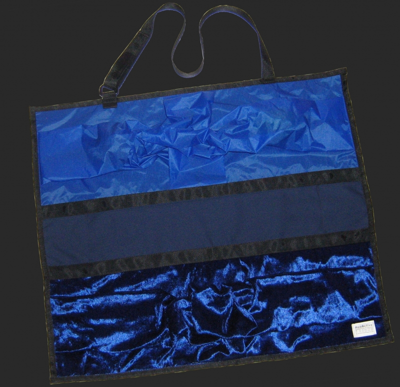 The Pinnymat is a specifically designed apron for those living with Dementia to distract from repetitive actions, undressing etc. The apron contains everyday items (a pocket with zip to place personal items to be discovered, velcro, buttons, studs, a bottle, sliders, shoe lace, buckle, D ring and beads in tubular webbing) to encourage manipulative skills, memory, motor skills and cognitive function. The neck strap has a velcro opening and there is also a strap at the waist.