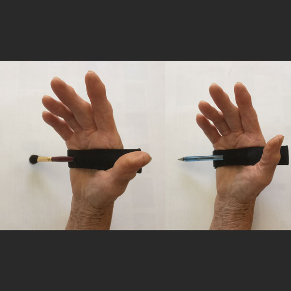 握力の弱い方、手首の切断手術を受けた方等にご使用いただける、右利き・左利き両用のストラップ式多目的カトラリーホルダーです。掌、もしくは前腕に心地よくフィットするよう、手の甲側にあるマジックテープで止め具合を調節してください。上側にくるマジックテープの端が右側になるようにし、スポーン等のカトラリーをホルダーに差し込んでください。また、同マジックテープの端が左側になるよう逆に装着することで、筆記補助具としてペンや絵筆などにもご使用いただけます。一般のカトラリー、筆記具をそのままホルダーに差し込んでご使用いただけます。