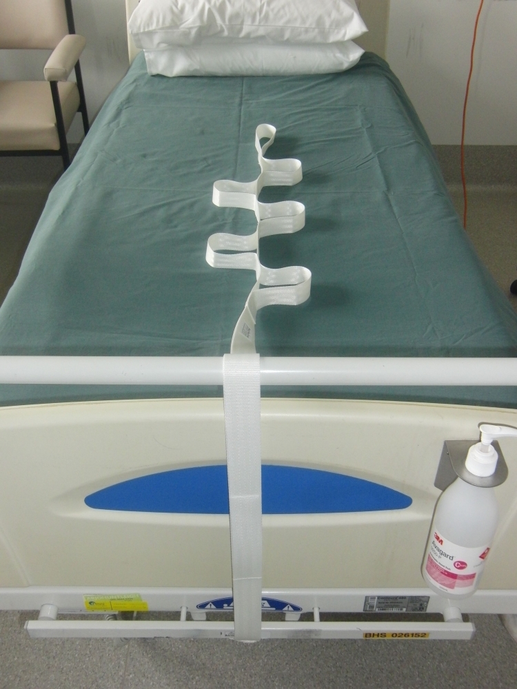 ベッド・ラダーは、起き上がり補助具「吊り輪」の代替品として考案されました。適当な長さとなるようロープを4つある取り付けループの1つに通し、ベッドの足側の柵、もしくはフレームに取り付け(説明文下写真)ます。離床の際、肩に掛かる負担を軽減させるため、ベッド・ラダーをベッドの上、利用者の方の手が容易に届く範囲内に置きます。手で最初のループを握り、または前腕を最初のループに通し、左右交互に6つのループを順番に手繰り寄せていき、離床、または臥床の動作を行います。素材はポリエステル100%のウェビングで、洗濯機での洗濯が可能です。