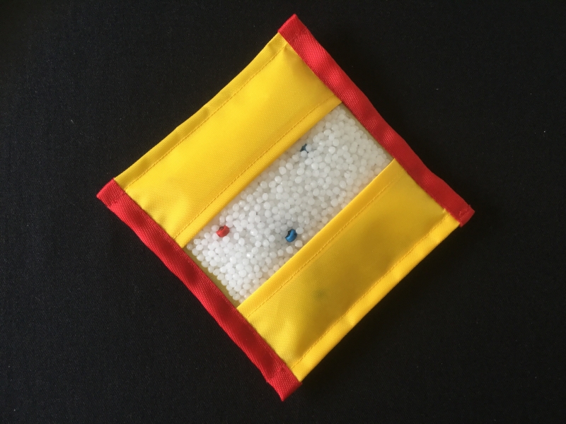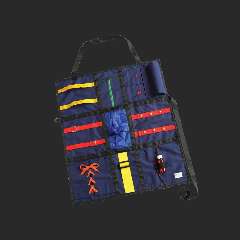 The Pinnymat is a specifically designed apron for those living with Dementia to distract from repetitive actions, undressing etc. The apron contains everyday items (a pocket with zip to place personal items to be discovered, velcro, buttons, studs, a bottle, sliders, shoe lace, buckle, D ring and beads in tubular webbing) to encourage manipulative skills, memory, motor skills and cognitive function. The neck strap has a velcro opening and there is also a strap at the waist.
