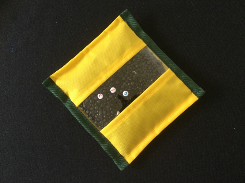 The water-resistant cushion with a clear panel contains 15 letters. Use as a distraction in the bathroom while the client/resident is being showered, especially useful during periods of extreme agitation.